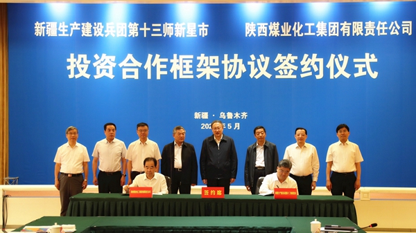 在雙方領(lǐng)導(dǎo)見證下,陜煤集團(tuán)副總經(jīng)理趙福堂與兵團(tuán)第十三師師長(zhǎng)、新星市市長(zhǎng)楊宏斌簽訂投資合作框架協(xié)議。雙方在煤基產(chǎn)業(yè)、硅基產(chǎn)業(yè)、新能源及輸配電、物流產(chǎn)業(yè)等領(lǐng)域合作達(dá)成共識(shí),開展系列項(xiàng)目合作。