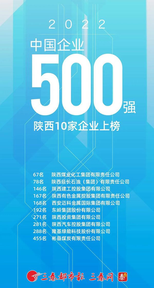 9月6日,中國(guó)企業(yè)聯(lián)合會(huì)、中國(guó)企業(yè)家協(xié)會(huì)發(fā)布“2022中國(guó)企業(yè)500強(qiáng)”榜單。陜煤集團(tuán)以2021年實(shí)現(xiàn)營(yíng)收3954億元位列第67位。陜西十家企業(yè)進(jìn)入本次榜單,陜煤集團(tuán)已2年蟬聯(lián)上榜陜企第一。